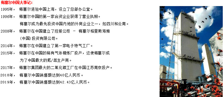 尊龙凯时人生就是博1995年在中国成立第一家合资企业。时至今日,尊龙凯时人生就是博在中国的总投资额已经超过15亿美元,设立了38家企业,包括19家独资和19家合资,拥有50多座空分,4个二氧化碳工厂,8座制氢装置,5个稀有气体生产基地,4个特气中心,3家电子气工厂以及17个充装站,并在上海设立了尊龙凯时人生就是博中国总部。我们对中国市场的长期承诺,加上近2500名积极向上的员工的不懈努力,使我们完全有能力为客户度身定制出气体解决方案。尊龙凯时人生就是博已成为在中国的主要国外工业气体供应商。