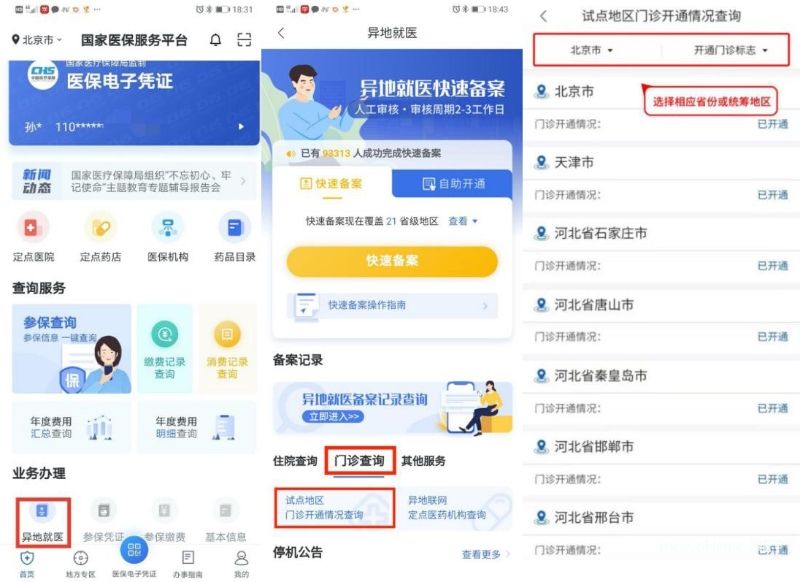 路径3:在主流应用商店下载并打开“国家医保服务平台”APP,点击“业务办理”中的“异地就医”,进入异地就医页面,点击“门诊查询”按钮,再点击“试点地区门诊开通地区查询”,可选择相应省份或统筹地区查看是否开通普通门诊费用跨省直接结算服务。